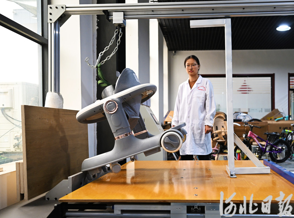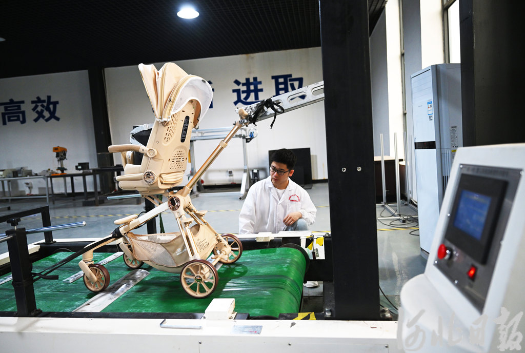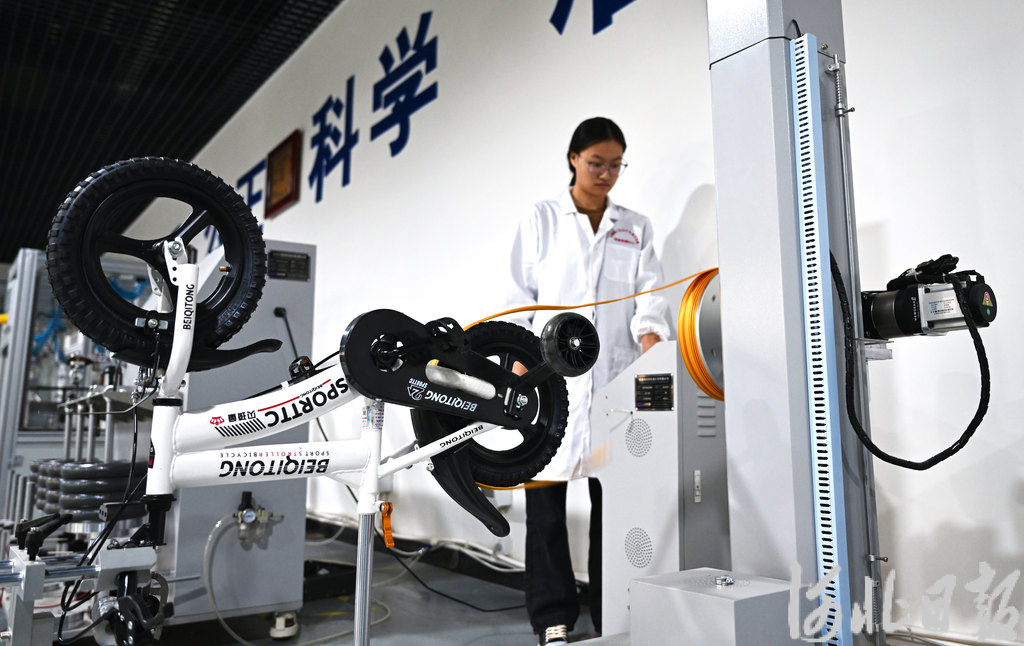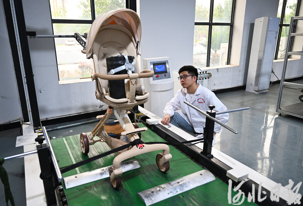4月18日,在平乡县中国轻工业自行车童车玩具检验检测中心,工作人员利用检测设备检测儿童推车的动态耐久性能。