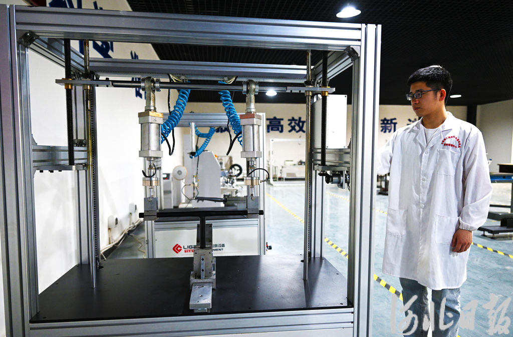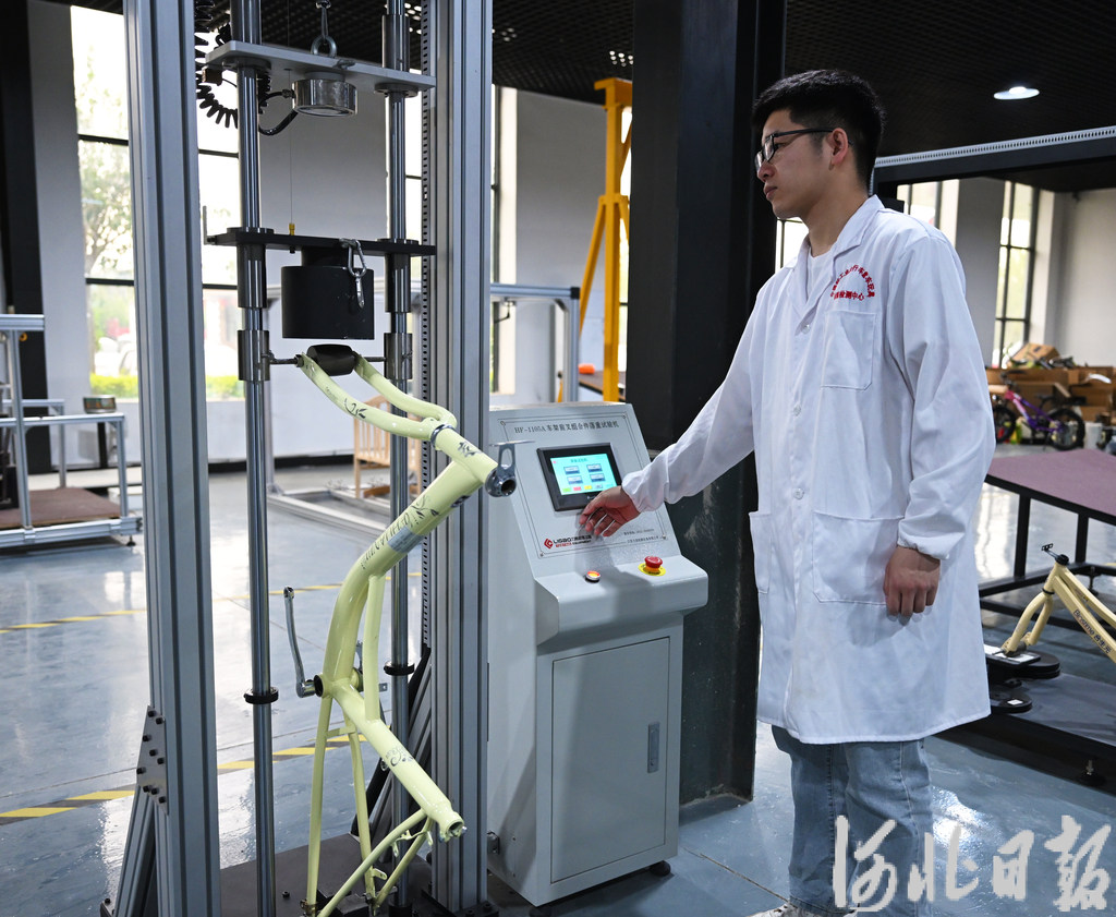 4月18日,在平乡县中国轻工业自行车童车玩具检验检测中心,工作人员进行自行车把横管和立管组合件的疲劳试验。
