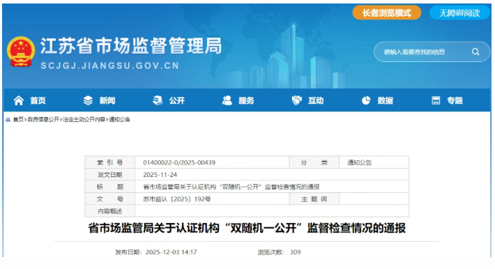 江苏省市场监管局关于认证机构“双随机、一公开”监督检查情况的通报