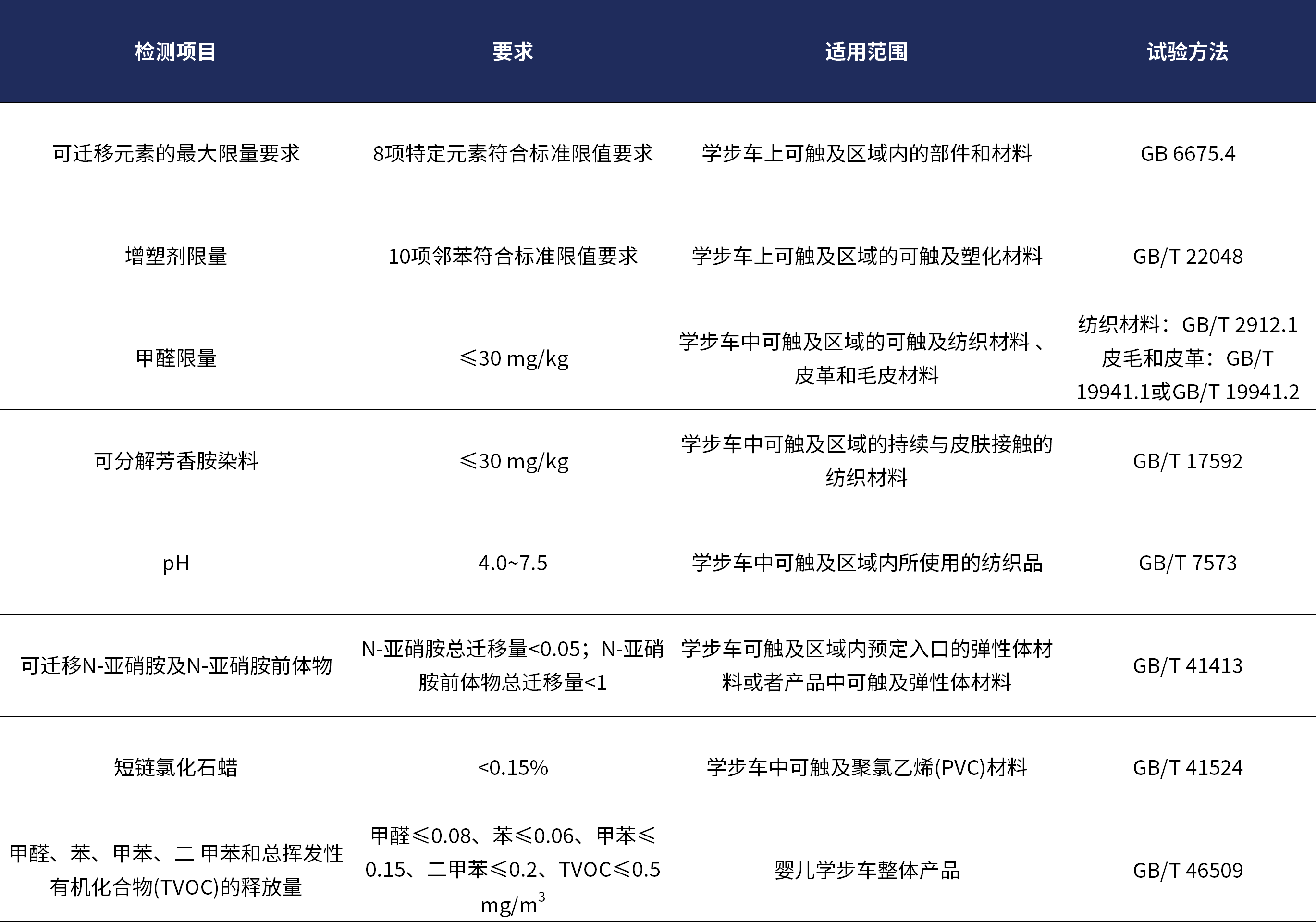 国家市场监督管理总局(国家标准化管理委员会)于2025年10月05日批准发布的GB/T 14749-2025《儿童呵护用品安全 婴儿学步车》推荐性标准将于2026年11月1日正式强制实施。新标在GB 14749-2006旧标准基础上更新了相关物理结构、强度及稳定性方面的安全要求,并增加了易燃性能测试,电性能测试及增塑剂、甲醛、可分解有害芳香胺染料、pH、可迁移N-亚硝胺、N-亚硝胺前体物、短链石化蜡、苯、甲苯、二甲苯、TVOC等有害物质的全新化学要求,全面升级了婴儿学步车类产品的安全质量管控指标。