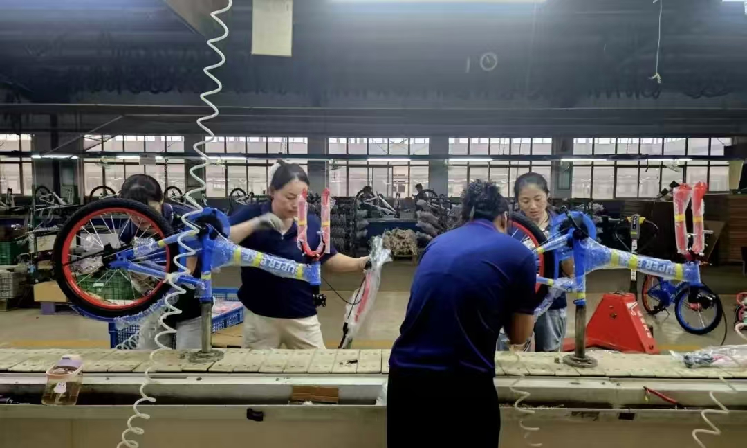 工人在生产线上组装自行车